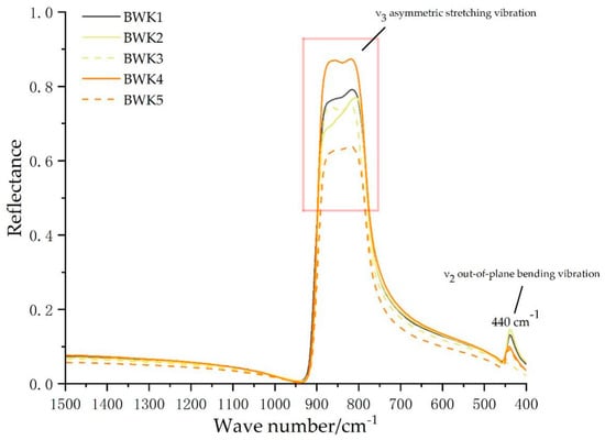 Figure 5 and Table 1 show the absorption peaks of the Xuebaoding scheelite samples in the fingerprint region (1500–400 cm−1). The results indicate that the absorption range from 900 to 800 cm−1 is attributed to the ν3 asymmetric stretching vibration (806, 817, 856, 867 cm−1) of the [WO4]2− tetrahedral group, and the absorption peak at 440 cm−1 is attributed to the ν2 out-of-plane bending vibration of the [WO4]2− tetrahedral group.