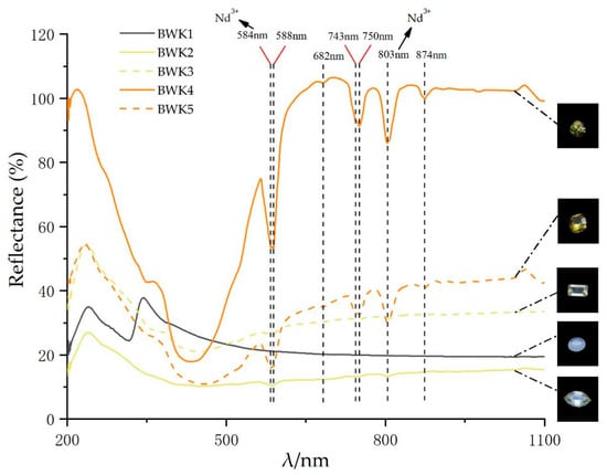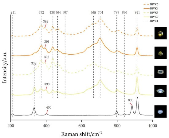 The colorless sample BWK1 only presented an absorption peak at 317 nm. The colored samples BWK2–5 showed many peaks and complex characteristics in the spectra: the absorption peak intensities of the orange-tone samples BWK4 and BWK5 at 584, 588, 682, 743, 750, 803, and 874 nm were significantly higher than those of the pale-yellow-tone samples BWK2 and BWK3; it is a preliminary inference that these absorption peaks may be related to the origin of the yellow-orange hue of scheelite.