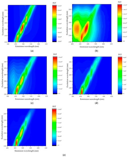 Three dimensional fluorescence spectra were recorded on a PerkinElmer fl6500 fluorescence spectrometer (Waltham, MA, USA). The test conditions were prepared as follows: an excitation wavelength of 230 to 290 nm, an emission wavelength of 400 to 650 nm, an excitation slit width of 20 nm, an emission slit width of 2.5 nm, scanning mode with a scanning speed of 1200 nm/min and a photomultiplier voltage of 250 V.