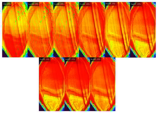 LA-ICP-MS mapping analysis was performed on the pale yellow scheelite sample BWK2 with parallel color bands. The REE enrichment images are shown in Figure 9. The enrichment degrees of rare earth elements Y, La, Ce, Pr, Nd, Sm, Eu, Gd, and Ho are positively correlated with the degrees of color saturation in the samples.