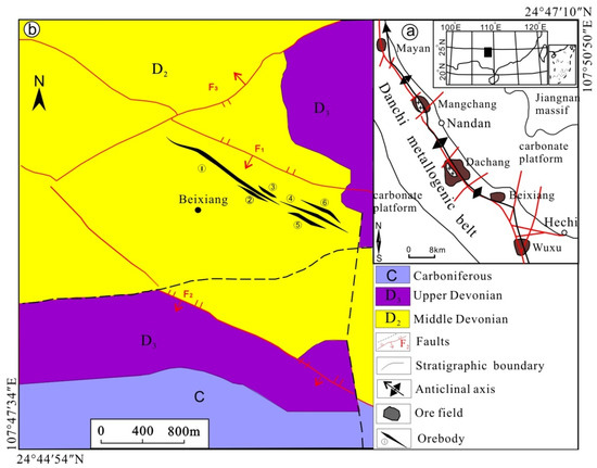 Sketch geological maps of the Danchi polymetallic belt (a) and the Beixiang deposit (b) [26].