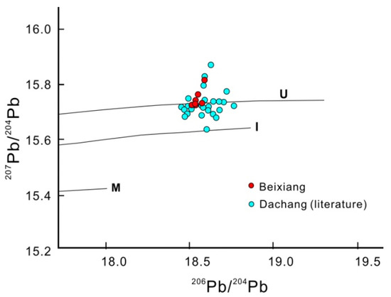 206Pb/204Pb vs.207Pb/204Pb plot of the Beixiang deposit. Plumbotectonic framework trends are plotted for reference (U: upper crust, I: orogen, M: mantle [34]).