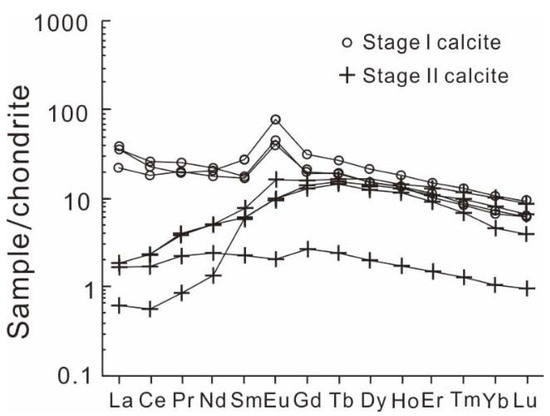 Calcite REE data are listed in Table 5 and plotted in Figure 7. Calcite samples from stage I and II ores have different REE chondrite-normalized patterns and Eu anomalies. Stage I calcite has total ∑REE = 49.32–54.96 ppm, (La/Yb)N = 2.15–4.91, and positive Eu anomaly (δEu: 2.06–2.68). Stage II calcite has much lower ∑REE (4.96–19.95 ppm) than its stage I counterpart. Stage II calcite is characterized by flatten chondrite-normalized REE patterns ((La/Yb)N = 0.14–1.57) with weak positive-to-negative Eu anomaly (δEu: 0.84–1.57) (Figure 7).