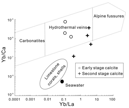 Plot of Yb/La vs. Yb/Ca in calcite. The areas of different types of calcite are from reference [48].
