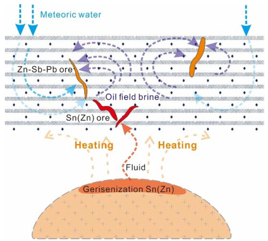 Previous works proposed that the late Yanshanian Sn-polymetallic deposits in SW China-western Myanmar were triggered by Neo-Tethys subduction and roll-back [12]. Consequently, we propose a model for the Beixiang Sb-Pb-Zn-Sn metallogeny (Figure 10): (1) the subduction of the Neo-Tethys Plate might have triggered Sn-bearing granitic magmatism with intrusions emplaced at depth under the Beixiang ore field; (2) the Sn-bearing granites might have underwent greisenization and released ore-forming fluids that moved upward to fracture zones and formed stage I Zn-Sn mineralization; and (3) the granitic magma and the related ore-forming fluid heated and triggered the circulation of meteoric water, which mixed with oil field brine at the shallow levels and then formed stage II Sb-Pb-Zn mineralization deposited at the top and around the first stage mineralization. Multi-stage mineralization with multiple sources of materials is the key factor for the co-enrichment of Sn-Sb-Pb-Zn within the Beixiang ore field.