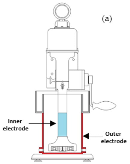 In this study, the method described in Maldonado et al., [25] to measure gas holdup in a laboratory flotation cell was implemented. The method comprises a laboratory Denver-type flotation cell whose vessel is equipped with an inner and outer electrode to measure the electrical conductivity of aerated suspensions. The inner electrode consists of a stainless-steel tube installed around the impeller shaft, whereas the outer electrode consists of the wall of the circular cross-section metallic flotation vessel itself as shown in Figure 1a,b. These electrodes are wired to a conductivity meter, Metler Toledo model M300 (See Figure 1c). The upper part of the vessel comprises an acrylic section that facilitates the observation of the pulp level and at the same time confines the electric field to the pulp zone.