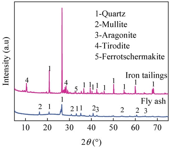 The experimental materials in this study included cementitious binder and aggregate. A type of P O 42.5-grade ordinary Portland cement (OPC) conforming with Standard GB175-2007 [31] and fly ash (FA) were supplied by Jianhua Building Materials Co., Ltd. (Shenyang, China). Iron tailing powder was collected from Waitoushan Iron Mine located in Liaoning Province. The chemical compositions of the Portland cement, IOTs, and FA are shown in Table 1. Figure 1 describes the mineralogical properties of FA and ITP. It is clear that the dominant quartzose mineralogical phase in ITP causes its very low reactivity and pozzolanic activity. Similarly, the peaks for the quartz phase are also observed in FA, but the intensity values are much lower, indicating the lesser content of quartz. Contrarily, silicate-aluminate crystalline is also abundant in FA, which identifies the potential pozzolanic reactivity that requires activation.