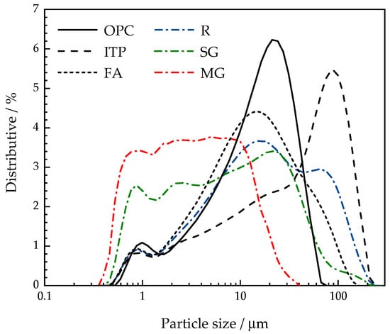 Figure 2 represents the PSD testing result of the raw materials and three SCMs. Compared to OPC, the particle size of ITP is much coarser, but FA is a litter finer. However, the partial FA grains are still coarser than that of OPC, the size of which is higher than 50 μm. The coarser particle size results in a lower specific surface area, impacting the reaction between the raw materials and portlandite. Meanwhile, the crystallinity and activity of the mineral inside the materials might also increase, and a poorer packing model will also probably occur. In view of this, mechanical activation, i.e., the grinding procedure, is required. Furthermore, both grinding methods significantly decreased the particle size of SCMs, where the concentrative range was reduced from about 100 to 0.6~10 μm. This indicates that the mechanical activation effectively increased the specific surface area of the materials, which is described as a dominant factor that improves the potential pozzolanic reactivity of silicate aluminate. Except for the pozzolanic reactivity, Seraj et al. [34] concluded that a finer SCM could also enhance the nucleation effect and development of hydrates, which partially compensates for the dilutionary effect resulting from the replacement of cement with a slower reactive pozzolanic material. Therefore, the particle size distributive property has a critical influence on the performance of SCM.