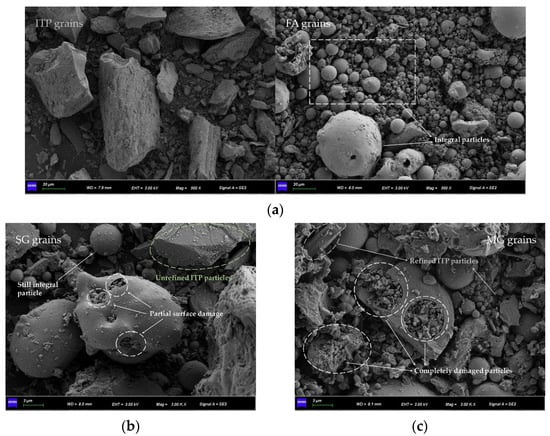 However, when another MG method was employed, the degree of grinding was more obvious than that of the SG method, as shown in Figure 3c. Except for surface abrasion and holes, completely broken FA and ITP particles and the production of many fine fragments are also observed. It can also be observed that FA was ground into a hemisphere with a particle size <3 μm. The halfsphere-shaped particles and ITP particles with few corners increased significantly, and the surface of the fine ITP particles gradually became spherical from the previous irregular shape. These experimental phenomena indicate that the both grinding procedures could significantly affect the morphological properties of raw materials, breaking the inactive external surface and releasing reactive silicate-aluminate, while the MG method had a better influence.