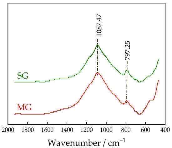 This indicates that the bands of the two SCMs with different ground methods are rare and mainly concentrated in the low wavenumber region, where the peaks are mainly around 1087 and 797 cm−1, which are related to the asymmetrical and symmetric stretching vibration of Si-O bonding, respectively.