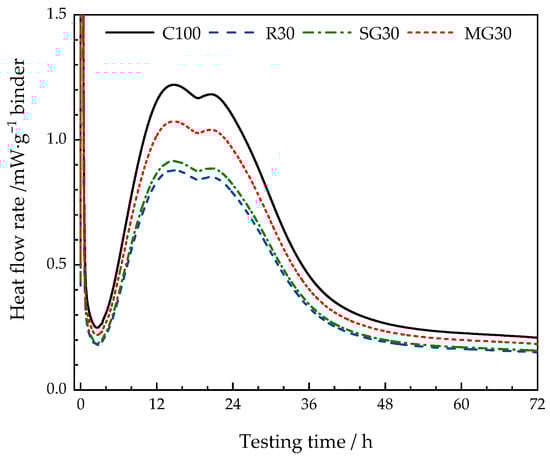 Comparatively, considering the three cement blends with different activated methods, it is also worth noting that the hydration heat value represents an increasing tendency. MG30 has the highest hydration heat flow while the R30 has the lowest. This experimental phenomenon is mainly due to the different PSD from the different grinding procedure, as shown in Figure 2. The particle size distribution of SCM had a dramatical influence on the nucleation effect, where the wide specific surface provides a site for the hydration of cement particles and the development of hydration products [37,38,39]. Meanwhile, a higher hydration heat was reported as a primary factor that dominates the shrinkage behavior and microcrack growth of cement composites [40,41,42]. It is clear that the utilization of SCM as a substitute of OPC can effectively relieve the high hydration heat flow; however, although the nucleation effect could partially compensate for the dilutionary effect of a lower cement content, the influence of SCM on the mechanical properties of cement composites is still noteworthy.