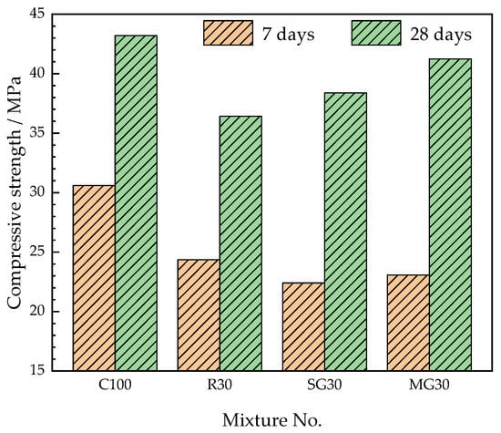 In order to investigate the effect of the binary supplementary cementitious materials and different activation methods on the properties of the OPC composite materials, 30 wt% of OPC was replaced by R, SG, or MG, labeled as R30, SG30, and MG30, respectively. In detail, OPC, SCM, and ISO sand were first mixed for 3 min, ensuring the homogeneity of the solid materials. Then, pure water was added, and the mixture was mixed for another 2 min in a w/b ratio of 0.5 following the Chinese Standard GB/T 17671-1999 [33]. Meanwhile, cemented mortar with only OPC as the binder was also developed as a reference, described as C100. Then, all the fresh slurry was transferred into molds (40 mm × 40 mm × 160 mm) and cured in curing conditions of 20 ± 1 °C and 95 ± 2% R.H. for 7 and 28 days.