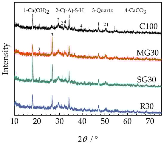 Figure 7 represents the XRD patterns of cemented paste after curing for 28 days. The dominant hydrates were Ca(OH)2 and C(-A)-S-H, which were mainly produced by the hydration reaction of cement particles. A small amount of CaCO3 was also detected due to the carbonation of Ca(OH)2. Meanwhile, quartz from the raw materials ITP and FA was also observed. This pattern demonstrates that the incorporation of all three binary SCMs does not change the type of hydration product. However, some interesting experimental phenomena should be noted. As discussed before, the character of SCM was mainly attributed to the pozzolanic reaction, where the active silicate-aluminate reacted with Ca(OH)2, producing excess C-A-S-H. Hence, the intensity of Ca(OH)2 is considered as a measurement of the pozzolanic property of SCM. It is also noted that MG30 showed the lowest peak at about 2 Theta = 18°, indicating that MG30 consumed the smallest content of Ca(OH)2 and showed a consistent compressive strength result.