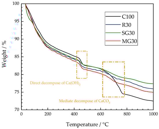 In order to verify this conclusion, a TG test was also carried out, as shown in Figure 8. The principle peak stage was around 450 °C, which is mainly caused by the thermal decomposition of Ca(OH)2 [50]. Based on the pozzolanic reaction between silicate-aluminate from SCM and Ca(OH)2, the direct decomposition of Ca(OH)2 and CaCO3 indirectly reflects the extent of SCM participating in the secondary hydration reaction, and the calculated Ca(OH)2 contents are tabled in Table 3. It can be concluded that in the 28-day hydration process, the content of Ca(OH)2 in the C100 sample was the highest, and all the blended binders with SCMs showed a decline, which can be explained as the synergism of the illusion effect and pozzolanic reaction. The loss of Ca(OH)2 in the MG30 sample was lower than that in the R30 and SG30 sample with the same cement content, which indicates that more Ca(OH)2 in the MG30 sample participated in the pozzolanic reaction. Further, it is also clear that the MG mechanical activation of binary SCM was more conducive to improving its pozzolanic reactivity than the SG one. The result of the thermogravimetric results also verifies the compressive strength result.