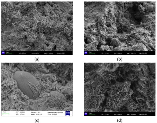 The micro patterns of cementitious pastes after curing for 28 days are shown in Figure 9. A large number of flaky Ca(OH)2, rod-shaped ettringite crystals, fibrous type I C-S-H gel, and other shapes of C-S-H gel are observed in all four cemented pastes and particularly in C100, which dominantly built the compressive strength. For the three blended cements, a large number of FA and ITP particles are clearly observed, indicating that although activated, the reactivity of the binary SCM is still limited, which explains the deterioration of the mechanical behavior. However, different from other samples, in Figure 9d, a large number of fibrous C-S-H gel and particulate C-S-H gel are alternately distributed and form a dense network together with the particles in MG30, leading to an integrated structure. Meanwhile, the C-S-H gel structure in MG30 is also different from the type II one of the C100, R30, and SG30 samples. The C-S-H gel ends are not bifurcated but directly overlap in a three-dimensional network. This structure shows a denser network shape and enhanced structural stability. At the same time, it is observed that part of the uniform particles such as the C-S-H gel aggregate into a whole, which increases the structural density and is conducive to the development of macro strength.