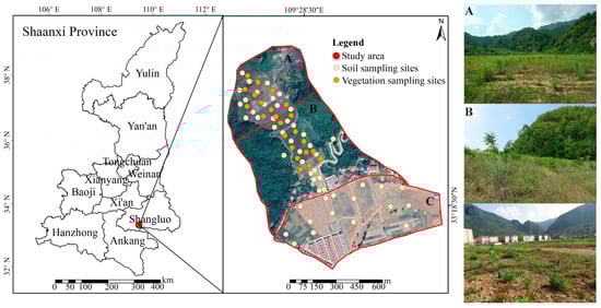 The study area is located in the southeastern part of Shangluo City, Shaanxi Province, China (Figure 1). It is between 108°34′20″–111°1′25″ E and 33°2′30″–34°24′40″ N. The study area is located in the Qinling Mountains, which is on the diving line between North and South China and the 800 mm precipitation line. In the horizontal direction, there are transitional characteristics of two climatic zones, the southern part has a northern subtropical climate and the northern part has a warm temperate climate. The annual average temperature is 7.8–13.9 °C, the annual average precipitation is 696–830 mm, and the annual average sunshine duration is 1848–2055 h. The soil type in the south of Shangluo City is yellow cinnamon soil [28]. According to the types of ore-bearing wall rock, the study area can be divided into primary ores (pyrite type gold ore and arsenopyrite-pyrite type gold ore) and oxidized ores (limonite type gold ore). Arsenopyrite and mispickel are the main gold-bearing minerals, and gold is closely related to Ae, Fe, especially As element. The Gold Production Company in research area operated in 1993 until 2006, a dam failure occurred. In 2016, Shangluo City’s first comprehensive treatment project for PTEs pollution in farmland soil (area C) was launched. The project adopted “microorganism + phytoremediation” technology for PTEs pollution in farmland soil (area C), and the project was completed in 2018. According to the Chinese Soil Environmental Quality Risk Control Standard for Soil Contamination of Development Land [29] and the Soil Environmental Quality Risk Control Standard for Soil Contamination of Agricultural Land [30], the study area can be divided into three subregions with different types (Figure 1). Area A is a pulp deposition area belonging to category 2 development lands where abandoned sludge accumulates with high As content. Area B is a hillside belonging to category 1 development lands, which is the buffer zone between the sludge deposition area and sloping farmland. Area C is farmland, belonging to agricultural land.