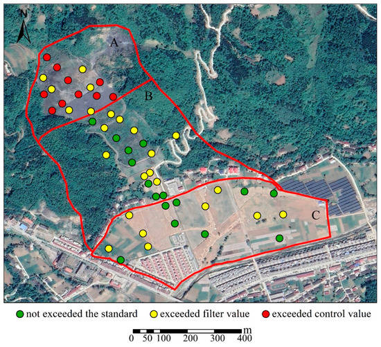 Figure 2 shows the over-standard situation of soil points in the mining area. It can be seen intuitively in Figure 2 that all soil samples in area A exceeded the standard, and 10 points exceeded the control value; 10 samples in area B exceeded the risk filter value of soil As contamination of agricultural land, and there were 8 points in area C that exceed the risk filter value.