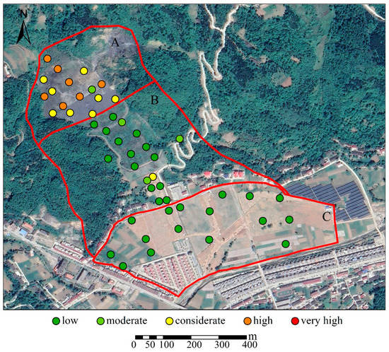 Study area and the distribution of soil sampling points; (A–C) means the land use types, the pulp deposition area (A), the hillside (B), and the remediation field (C).
