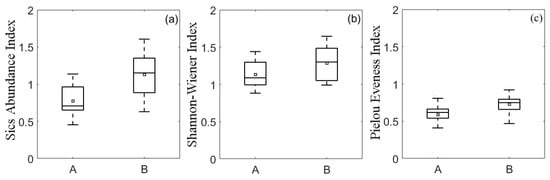 Vegetation Species diversity index in area A and B. (a) means Sics Abundance Index, (b) means Shannon-Wiener Index, (c) means Pielou Evenness Index.