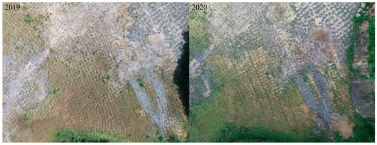 Comparison of vegetation coverage at the same location in the study area in 2019 (left) and 2020 (right).