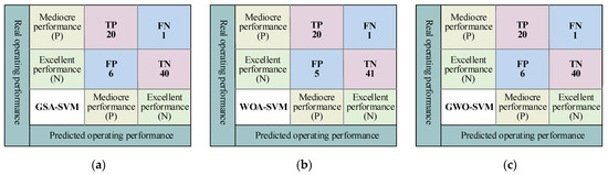 Figure 8 and Figure 9 show the confusion matrices of different models and their comparison, respectively. Using the various models, the TP and FN samples were similar, while FP and TN samples differed greatly. FA-SSA-SVM had the smallest FP and the largest TN. The advantage of FA-SSA-SVM lies in the fact that it was comfortably able to avoid the error prediction (i.e., negative was mis-predicted as positive, FP), and it also achieved correct prediction (i.e., negative was predicted as negative, TN).