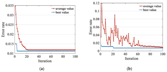 In addition to the evaluation index based on the confusion matrix, the convergence of the model was also compared. Figure 11 shows the convergence of the six hybrid models. Each model takes the predicted minimum error rate as the value of the objective function. The optimal value of the objective function in each iteration and the average value of the population were obtained. It can be found that the convergence was faster in GSA-SVM and FA-SVM, and the average value fluctuated greatly in the iterative process of WOA-SVM and GWO-SVM, while the other models were less volatile. In addition, SSA-SVM converged slowly, but it effectively minimized the objective function. The improved FA-SSA-SVM integrated the advantages of FA and SSA, which meant that it moved fast to attain the highest accuracy.