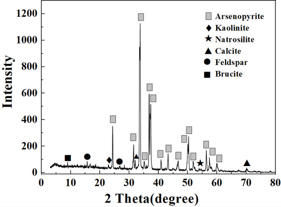 The massive arsenopyrite was roughly picked from the Wulonggou mine of Dulan Jinhui Mining Co., Ltd. (Haixi Zhou, China). Bulk mineral samples were crushed using a ceramic hammer and carefully hand-picked to obtain the arsenopyrite as pure as possible. Then, it was ground in a ceramic ball mill. Finally, −20 μm arsenopyrite was obtained by elutriation method [15], and was used for X-ray fluorescent spectroscopy (XRF), X-ray diffraction (XRD), flotation tests, and other detections. The XRF results showed the main elementary composition of arsenopyrite was 43.46% As, 19.64% S, 32.44% Fe, and 98 g/t Au, and the purity was about 95%. The high purity of the arsenopyrite was reconfirmed by XRD pattern (Figure 1) with the corresponding Powder Diffraction File (PDF) data.