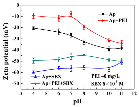 Figure 3. Effects of pH on the zeta potentials of arsenopyrite surface in the presence of 40 mg/L PEI and 8 × 10−5 M SBX (Ap represents arsenopyrite).