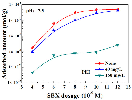 In order to quantitatively study the influence of the PEI addition amount on the adsorbed amount of SBX, adsorbed amount measurement tests were conducted. The results are shown in Figure 4. The adsorbed amount of SBX on the arsenopyrite surface increased with the increasing initial concentration (dosage) of SBX. When the initial SBX concentration was greater than 8 × 10−5 M, this trend became unconspicuous, e.g., the SBX adsorbed amount had a hundred times difference at 4 × 10−5 M and 8 × 10−5 M, but from 8 × 10−5 M to 1.2 × 10−4 M, the adsorbed amount had the same order of magnitude. Generally, by increasing the collector dosage, monolayer adsorption gradually forms, which is responsible for the above trend [22]. When there was 40 mg/L PEI in the solution, the adsorbed amount of SBX only showed a slight decrease at any of the initial SBX concentrations, showing the slight influence of PEI on the adsorption of SBX onto arsenopyrite, which was in line with the results of the zeta potential. If the dosage of the PEI increased to 150 mg/L, the adsorbed amount of SBX on the mineral surface decreased a lot, suggesting that the pre-treatment of excess PEI greatly depressed SBX adsorption. This could be ascribed to the coverage of the polymer PEI on the arsenopyrite surface at high dosages; the steric hindrance brings difficulties to the further adsorption of SBX [23]. This reminds us that a moderate dosage of PEI flocculant may encourage flotation, whereas excess flocculant is just the opposite to one’s wishes.
