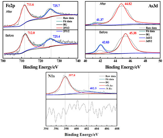The interaction between the spin magnetic moment and the magnetic field, i.e., spin-orbit coupling, results in the level splitting except for the s level [24]. So, the As 3d and Fe 2p all have two peaks corresponding to 3d 3/2 and 3d 5/2, and 2p1/2 and 2p3/2 energy levels, while the N1s spectra display only one peak. If the interaction between the mineral surface and other matters causes valence electron transfer/sharing, the element chemical shift occurs for the surface element [25]. Here, the XPS spectra of the arsenopyrite surface with and without treatment with PEI were obtained to explain the adsorption mechanism. The elements As, Fe, and N on the arsenopyrite surface-detailed scan spectra are shown in Figure 5. Due to the N element not being present on the arsenopyrite surface, it cannot be detected except for showing some miscellaneous peaks caused by instrumental noise.