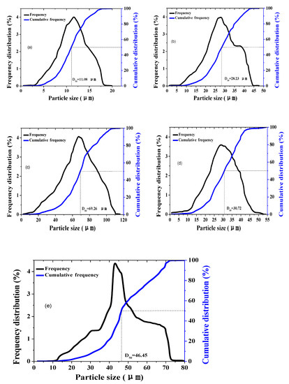 Particle size has a great influence on the theoretical research and practical applications of filler and powder materials. Previous studies have shown that particle size has a significant influence on the stiffness, strength, and toughness of layered silicate and carbon nanotube-reinforced polymer nanocomposites [1]. It was found that with the decrease in particle size, the energy gap increased and the electrical conductivity decreased for pure nano TiO2 prepared by hydrolysis and gelation of titanium isopropoxide [2]. In the mineral processing field, the “Elephant Curve” shows a maximum recovery at around 100 µm and a decrease in the flotation performance for smaller or larger size particles [3].