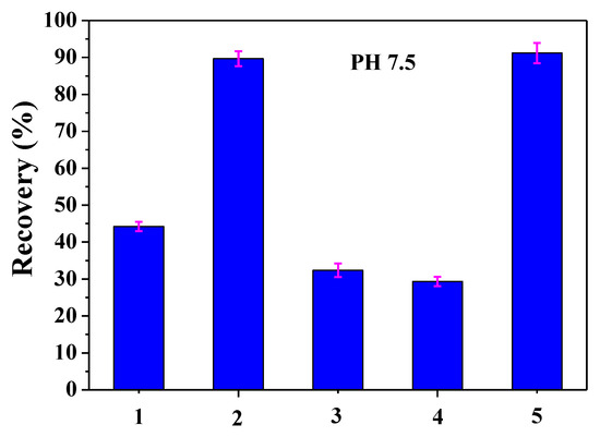 Figure 7. Flotation recovery versus reagent condition at pH 7.5. (1—8 × 10−5 M SBX; 2—40 mg/L PEI and 8 × 10−5 M SBX; 3—150 mg/L PEI and 8 × 10−5 M SBX; 4—40 mg/L PEI and 4 × 10−5 M SBX; 5—40 mg/L PEI and 1.2 × 10−4 M SBX).
