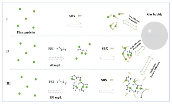 We compared the model of the possible states in the pulp that occurred with different PEI dosages in Figure 8. Hydrophobicity and particle size are two important factors affecting the flotation of particles [31]. For condition I, when no PEI was added before SBX, the SBX anions adsorbed on the arsenopyrite surface and resulted in the hydrophobic particles, but due to their small size, the collision probability between the particles and the bubble was low, and thus the recovery was low [32]. For condition II, as moderate PEI (here 40 mg/L) was added into the pulp, its molecules adsorbed several particles and brought forth bridging interactions to flocculate fine arsenopyrite particles to a size suitable for the flotation; meanwhile, there were still enough Fe/As sites for the further adsorption of SBX. For condition III, when excess PEI (here 150 mg/L) was added before SBX, plentiful PEI molecules flocculated the fine particles to oversize ones, which caused the desorption probability from the bubbles to increase [33]; moreover, abundant PEI covered these particles and occupied the Fe/As sites so that the SBX could not be further adsorbed and the recovery was therefore low.