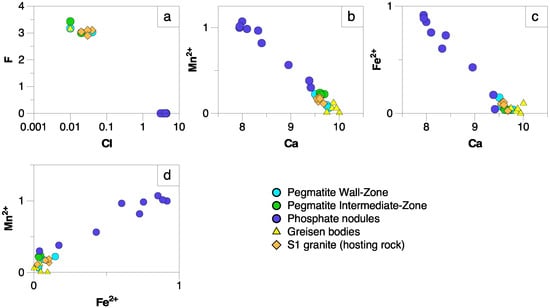 Fluorapatite is by far the most common member of the apatites considered in this study, with important variations in the mean F contents depending on lithology (Table 2 and Table 3; Figure 2a and Figure 3a–c). The highest mean contents correspond to the apatite from the less evolved granites and the quartz veins (3.74, 3.61; 3.04 wt.% for the S2 granites, the quartz veins and the S1 granites, respectively). The lowest F values are found in the Li-rich pegmatites (mean F content of 2.57 wt.%), followed by the highly evolved (B-P±F-rich) leucogranites, with a mean F value of 2.92 wt.%. The Cl concentrations are quite low in general, with mean values < 0.74 wt.%, and the highest contents (4.37 wt.%) corresponding to apatite from the P-rich pegmatites (Figure 2b and Figure 3a–c).