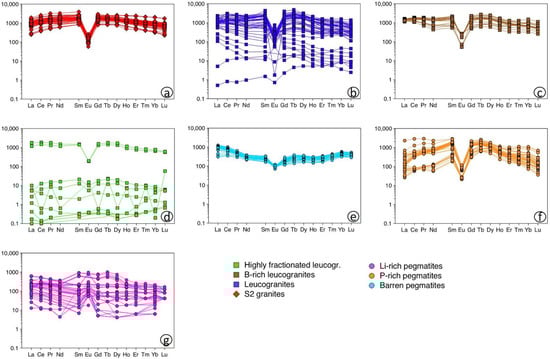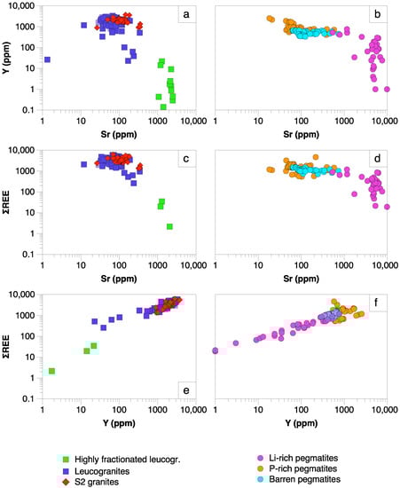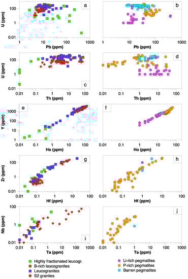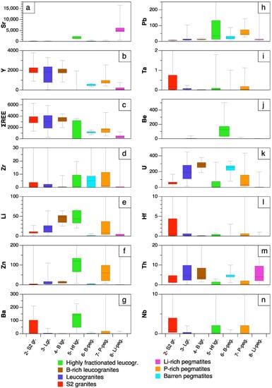 - Antunes, I.M.H.R.; Neiva, A.M.R.; Farinha Ramos, J.M.; Silva, P.B.; Silva, M.M.V.G.; Corfu, F. Petrogenetic links between lepidolite-subtype aplite-pegmatite, aplite veins and associated granites at Segura (central Portugal). Chem. Erde Geochem. 2013, 73, 323–341. [Google Scholar] [CrossRef]