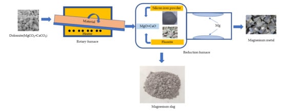 The Pidgeon process is the main method to produce magnesium in China, as shown in Figure 1. Dolomite, as raw material, is calcined in the rotary furnace, the product is mixed with reducing agent silicon iron powder and catalyst fluorite, then ground and pressed into pellets, and the pellets are put into the reduction furnace. Under the condition of temperature 1200 °C and internal pressure of at least 13.3 Pa, magnesium appears in the form of steam, passes through the condenser, forms crystals, and is finally refined by solvent to produce magnesium []. The remaining material in the reduction furnace is the MS.