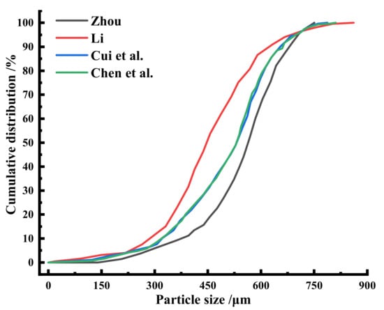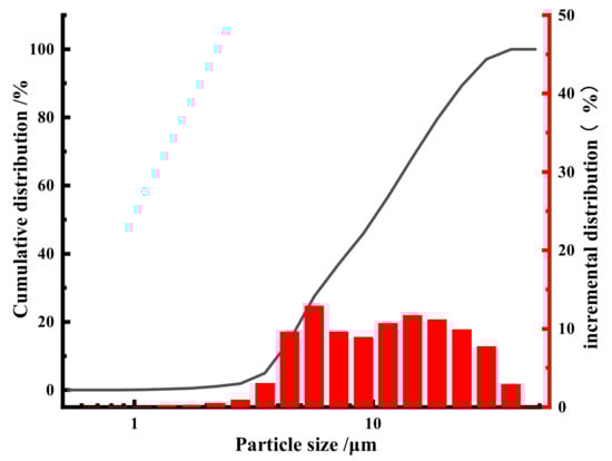 MS is a gray substance, similar in color to cement, odorless, with a particle size between 0 and 10 mm, and slightly sticky to the touch. After experimental analysis, it was learned that [], using the MS from a large magnesium smelting enterprise in Shanxi, the loose density was measured to be 1.15 g/cm3, and the average true density was 2.89 g/cm3. The magnesium residue is sieved, and the particle size distribution is shown in Figure 2 [,,,].