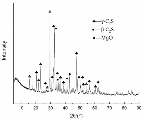 The XRD pattern of the MS samples is shown in Figure 3. It is seen that γ-Ca2SiO4 (γ-C2S) is the main phase that causes the decomposition of MS, in which f-MgO is the secondary phase, and β-Ca2SiO4 (β-C2S) is a trace phase, which indicates that a small amount of β-C2S can occur in the cooling slag particles.