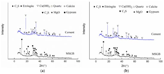 (5) The special properties of backfilling materials, such as their higher water–cement rate and lower strength request, make it possible to realize the large-scale utilization of MS. The strength of the sample prepared with MSGB, composed of MS, gypsum, and BFS, was equivalent to or higher than the ones with cement. The pressure drops of a slurry prepared with MSGB are calculated through a theoretical formula, and the results can be used as a reference for the design of the backfilling system. The main hydration products of MSGB were ettringite, C-S-H, unhydrated C3S, C2S, and MgO.