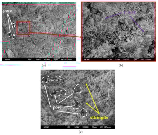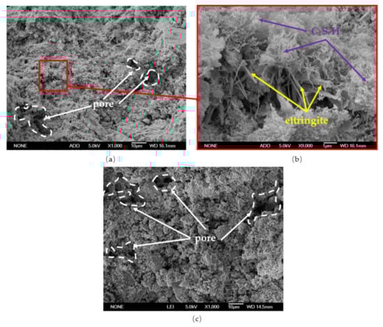 The sulphate resistance properties of concrete can be improved by increasing MS content. After 150 cycles of sulphate attack, the sulphate-resistant coefficient of the reference sample (without MS) jumped down to 68%. The coefficient of concrete containing MS increased as the MS content increased []. This is due to the low reactivity of MS and the comparatively low Al2O3 content of MS. The number of hydration products that can react with SO42− to form expanded products reduced after the MS replaced the cement []. In this case, the internal stress caused by expansion was reduced, and the sulphate resistance of the concrete was greatly improved.