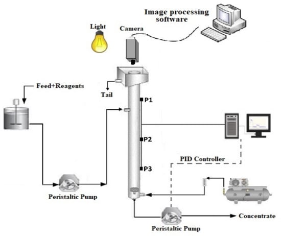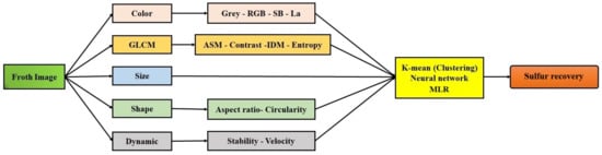 In recent years, there has been a rapid development in computing technology with an increased interest in machine vision applications for monitoring, analyzing and controlling the output of processes for most engineering purposes [,]. Machine vision is an automated, non-destructive and cost-effective alternative method used for the on-stream estimation of the efficiency of the flotation process. Image processing methods have been developed for the extraction and interpretation of froth appearance features such as color and texture [,,,], velocity [,], mineral loading rate [], stability [,], and bubble size [,]. These studies showed that many methods can be used to extract and analyze the froth features; thus, several extracted features should be addressed at the same time for a better interpretation of froth behavior.