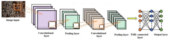 CNN is considered to be one of the most popular NNs for image classification problems. Basically, a CNN is a kind of feedforward NN which comprises two main sections: The first section (feature extraction) comprises input layer, convolution and pooling layers and the second section (classification) consists of a dense (flattened) layer, fully connected layers and an output layer []. Figure 5 illustrates the architecture of a typical CNN.