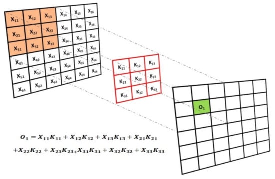 The convolutional layer (CL) is the main part of a CNN which extracts features by convoluting the kernel (filter) over an original image (matrix). The filter works by moving a window from left to right and top to bottom to multiply and sum each position of the source pixel (Figure 6). Each convolution layer adopts a 3 × 3 filter with a stride of 1. ReLU (rectified linear unit) is used as an activation function after each CL. ReLU is always levelled as 0 and 1. The pooling layer decreases the dimension of feature maps while keeping the most important information to avoid overfitting []. It is generally situated between consecutive CLs. The maximum pooling function adopts a matrix of size 2 × 2 (Figure 7).