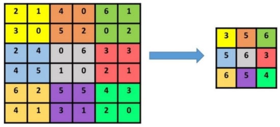 The convolutional layer (CL) is the main part of a CNN which extracts features by convoluting the kernel (filter) over an original image (matrix). The filter works by moving a window from left to right and top to bottom to multiply and sum each position of the source pixel (Figure 6). Each convolution layer adopts a 3 × 3 filter with a stride of 1. ReLU (rectified linear unit) is used as an activation function after each CL. ReLU is always levelled as 0 and 1. The pooling layer decreases the dimension of feature maps while keeping the most important information to avoid overfitting []. It is generally situated between consecutive CLs. The maximum pooling function adopts a matrix of size 2 × 2 (Figure 7).