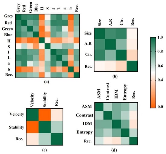 Pearson correlation matrix between the inputs and output. (a) color; (b) size and shape; (c) dynamic; (d) textural properties.