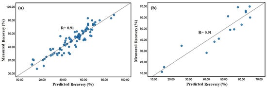 The correlation coefficient is a statistical measure that is commonly used to calculate the strength of the relationship between two variables []. In order to select the appropriate variables and minimize the required dataset, the Pearson correlation coefficients between the froth features and the sulfur recovery were implemented. The values of the correlation matrix between the froth images features and the recovery are shown in Figure 8. As shown in the heatmap, color features obtained from the froth images except H and b were strongly associated with the amount of sulfur removal, showing almost similar correlation coefficients. As a result, these parameters were suitable for the sulfur recovery estimation. Furthermore, there were very weak correlations between the H, b and the recovery. Therefore, these two features were excluded from the model predictors due to having a low contribution rate.