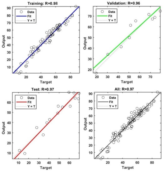 NNs are nonlinear computational methods that have been successfully used in various fields of science and technology over the past decade [,,]. The main feature of the NN is its ability to learn the complex relationships between input and output data. The main advantages of the NN models are as follows: (1) It only considers the input and output data without referring to the process phenomenology; and (2) it has a generalization ability to accurately estimate the outputs corresponding to a new dataset that were not applied for training of the model [,].