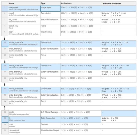 Many popular CNN architectures have been developed such as LeNet, GoogleNet, VGG16, ResNet, and AlexNet to solve machine vision-based problems []. In this study, ResNet18 was selected. MATLAB 2021a (The MathWorks, Inc. protected by U.S and international patents), with Machine toolbox deep neural network designer, was used in this experiment.