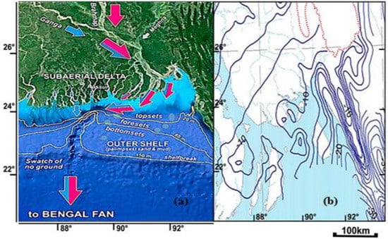 During the Precambrian era, the Indian Plate (IP) was a focal point of the Gondwana supercontinent (GS), and it began to split apart in the Middle Jurassic (170–175 Ma) [2]. The IP shifted and detached from its surrounding cratonic blocks (55.9 Ma) [12]. Geotectonic Province 1 (Bengal Basin’s stable shelf) was formed from the IP. Prior to 50–55 Ma, the Indian and Eurasian Plates clashed, lifting the Indian Plate onto the Eurasian Plate. The tectonics and erosion formed the Himalayas [12,13,14]. The Hatiya Trough is part of the Bengal Basin’s tectonic map [2,14]. The Indian Plate’s ocean sediment exited the Bengal Basin [15,16,17,18]. The Bengal Foredeep Basin (BFB) has profited the most from the deepest trough’s sediment. Bengal deep-sea Fan opens into the Hatiya and Faridpur Troughs [2]. Oligocene sediments from the Himalayas fill the Bengal Basin [19]. The Bengal Basin has two tectonic states: the Indian platform and the deeper basin. The Chittagong-Tripura Folded Belt is in the southeast, the Surma subbasin (Sylhet Trough) is in the northeast, and the deeper Bengal Basin, which includes the Hatiya Trough, is in the northwest (Chandpur Barishal) [20,21,22]. The Hatiya and Faridpur Troughs are separated by the Chandpur-Barisal High [23]. The Indian Plate lies 16 km below the Hatiya Trough’s 18 km sediment layer [16]. In the Hatiya Trough, Plio-Pleistocene sediments cover the Holocene layers by 480 m [24]. The Hatiya Trough is one of the five tectonic zones in the deep basin [20,23,25]. The 200-m bathymetric contour limits the basin boundary in the Hatiya Trough, south of the Bay of Bengal deltaic zone. This waterway formed when sediments were deposited (Figure 1a), and the reservoir where the Pliocene anticlines are developed. Late Miocene to early Pliocene channels are eroded (Figure 1b) [24]. The minor arc-derived sediments from the Trans-Himalaya or Paleogene Indo-Burman Ranges were present, although the lithology existed from the Miocene to the recent past [25]. Only the Bhuban Formation has a gas-producing sand zone [20]. Recent GPS-derived geodetic data shows that the Hatiya Trough subsidence rates vary [26]. The Hatiya beaches, in this way, deposits valuable mineral sands.