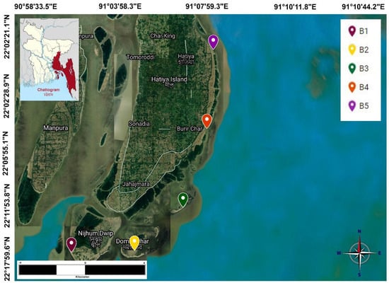 The present study area is located at Hatiya Upazila in the Noakhali district of Bangladesh. It is a stable sand beach area which extends over a length of 10 km and a width of 1 km from the Meghna River’s upstream to downstream (22°02’21.1” N; 90°58’33.5” E—22°17’59.6” N; 91°10’44.2” E) (Figure 2). The study covers an approximate area of 10 km × 1 km, from where five successive sites were chosen for sampling and assigned the sampling codes of NDB, DCB, NB, QBB, and RBB. One or two mixed samples were collected from each location’s river bed and beach sand, to ensure the representativeness of the sampling location (based on our physical observation), with respect to the whole beach. Using the global positioning system (GPS), the sample locations were recorded in degrees, minutes, and seconds (latitudinal and longitudinal position). The distance between each sampling location/point was approximately 2 km. During the summer of 2019, all samples were collected using a spade at a depth of 1 m, then placed in polyethylene bags and transported to the Bangladesh Council of Scientific and Industrial Research (BCSIR) laboratory for subsequent processing. Each sample weighs approximately 1 kg. The samples were allowed to dry in the open air, at room temperature.